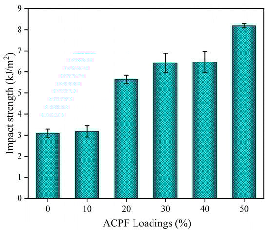 Figure 11 highlights the relationship between impact strength and fiber loadings. Fiber loadings from 10 wt.% to 50 wt.% demonstrated an up–trend in impact strength. The impact strength of PLA/ACPF composites with 50 wt.% fiber content reached 8.2 kJ/m2, more than two folds of pure PLA. It was higher than the 1.7 kJ/m2 value for PLA/sisal fibers and 2.25 kJ/m2 value for PLA/coir fibers reported by Duan et al. [37]. Because the bonding of the fibers with the matrix was good. The fibers absorbed more energy when they were pulled out. The SEM analysis showed that the fracture of the matrix was accompanied by the tearing and fracture of the fibers, which also absorbed much energy [56,57,58]. With the increase in fiber loadings, more fibers participated in the impact load.