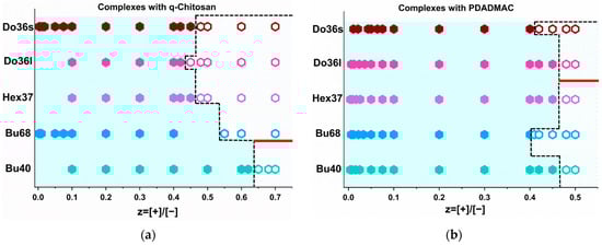 Phase behaviour of the complexes with (a) q-chit and (b) PDADMAC at a fixed concentration of polyanion of 5 g/L and at T = 25 °C. The light blue area points out the 1-phase region which is separated from 2-phase region with a dashed line. For open symbols for 2-phase region, the formation of precipitates in the biphasic region is indicated under the red line and that of coacervates above the red line.