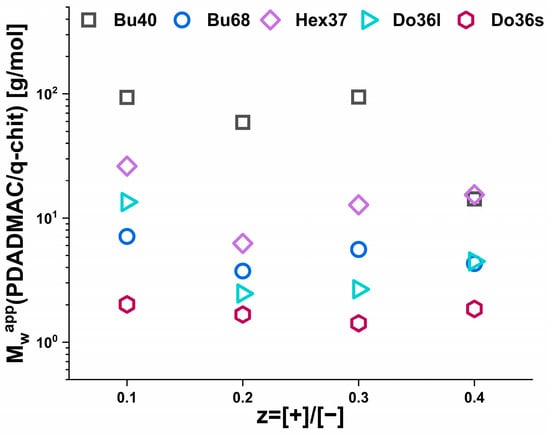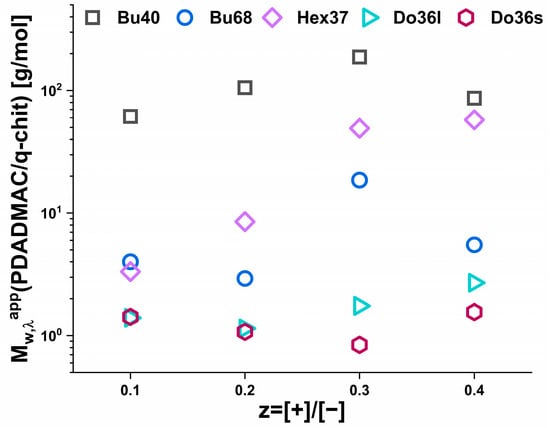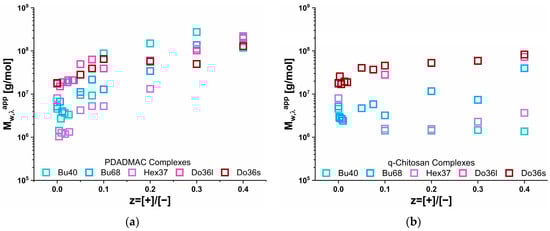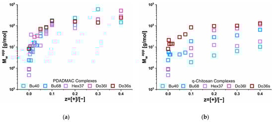 Looking at the pure polyanions, one could observe the much weaker aggregation of the butyl- and hexylacylate copolymers compared to the dodecylacrylate, which is in good agreement with previous studies on the self-assembly of the pure copolymers [28]. The apparent molecular weight (Mwapp) as a function of z is shown in Figure 4 and confirms the substantially different behaviour for the IPECs formed with q-chit (Mw = 180 kDa) and PDADMAC (Mw = 150 kDa), as already seen in the turbidity measurements (Figure 2, a direct comparison between the results of turbidity and static light scattering results is shown in Figure S1). For q-chit, a continuous increase (or rather constant value for Do36s or Hex37) was observed, except for the addition of a polyelectrolyte onto an existing micellar copolymer aggregate. When comparing the increase with the one expected simply from assuming the stoichiometric addition of polycation to the existing structure of the anionic copolymer (Figure S1), one observed that this picture was quite well fulfilled for the complexes with q-chit. In contrast, PDADMAC addition was only in good agreement for the Do36s, while for all other copolymers, a much more marked increase was seen that demonstrates the formation of much larger complexes. As seen in the turbidity data, for the addition of PDADMAC, there was a drastic increase in scattering intensity at low z values that in light scattering was even more pronouncedly visible already for the addition of very small amounts.