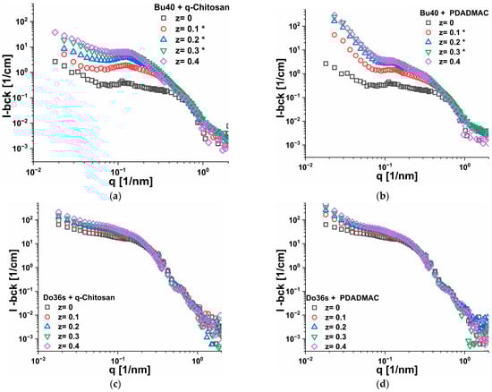 SANS intensity as a function of q for all z ratios from 0 to 0.4 for samples of 5 g/L (a,b) nBu40-b-AA167 (Bu40) or (c,d) nDo36-b-AA71 (Do36s) complexed with different amounts of either q-chitosan or PDADMAC (data from LLB which were corrected with respect to HZB data and ones from HZB which are marked as *. see Supplementary Materials Section S6.2).
