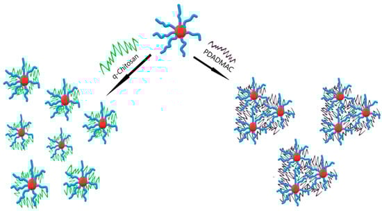 Similar-sized aggregates were formed upon complexation with PDADMAC or q-chit; for PDADMAC, light scattering and the low q-range of the SANS data showed a very marked increase in intensity, which could be interpreted as an interconnection of the different IPEC aggregates by the polycation. This was not surprising since the polycations employed for complexation were much longer (~450 nm) than the average spacing between the IPEC aggregates, and SANS showed that, typically, there was less than one polycation contained in an aggregate. However, despite the fact that q-chit and PDADMAC had a similar stretched length, they showed here markedly different behaviour. This may be attributed to the fact that q-chit had an intrinsically lower affinity to be dissolved in water and bound more strongly to the polyacrylate. As a result, it formed a more compacted IPEC shell, while PDADMAC could extend more easily out from the shell of the IPEC micelles into the aqueous surroundings, thereby being able to bridge to neighbouring aggregates. This different structural behaviour is depicted in Figure 8 and was confirmed by the macroscopic viscosity of the solutions of the different complexes, which was more than twice as high for PDADMAC complexes compared to those with q-chit (Table S4).