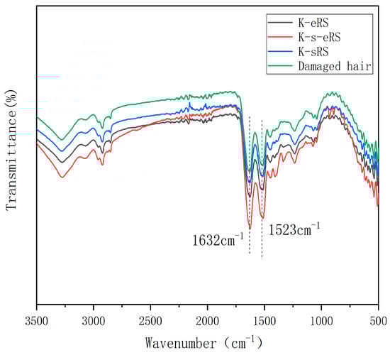 After the addition of serine, the peak area of the amide band at a wavelength of about 1600~1500 cm−1 was the largest in the damaged hair sample, which proved that the keratin-serine plus enzyme repair solution was used to repair the damaged hair sample efficiently [18]. Although the band area of the keratin plus enzyme repair hair sample was larger than that of the damaged hair sample, the amplitude was much smaller than that of the keratin-serine plus enzyme repair hair sample, indicating that the effect of adding serine was better. The peak area of the specific amide band of the keratin-serine repair hair sample was only slightly increased compared with that of the damaged hair sample, indicating that the effective component of the hair care was weakly bound to the damaged part and lost in the cleaning, which proved the importance of the catalytic crosslinking of the TG enzyme.