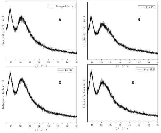 X-ray diffraction pattern of damaged hair and treated samples (A–D): (A) Damaged hair; (B) K-sRS; (C) K-eRS; (D) K-s-eRS.