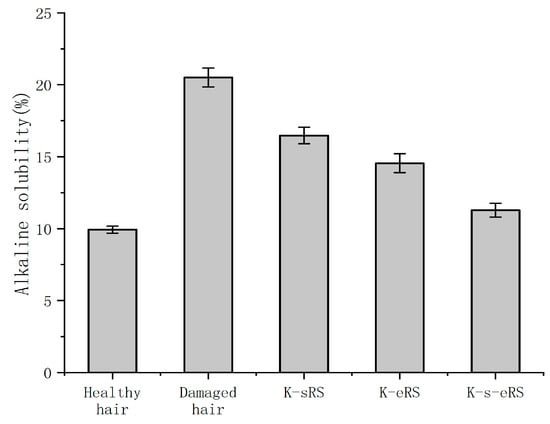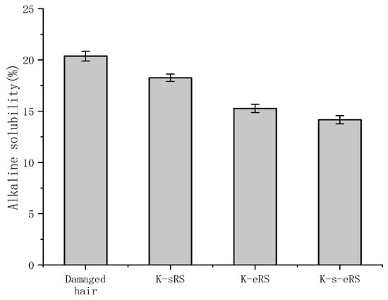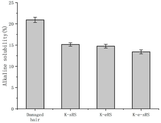 Treated hair samples were added to 100 mL 0.2 M NaOH and held at 65 °C for 1 h. The reaction was filtered, and the filtrate was washed with distilled water or dilute acetic acid and then dried to constant weight in an oven at 65 °C [17]. Three parallel experiments were carried out for each repair solution. Calculation of alkali solubility was based on the weight change in the hair sample before and after alkali treatment: