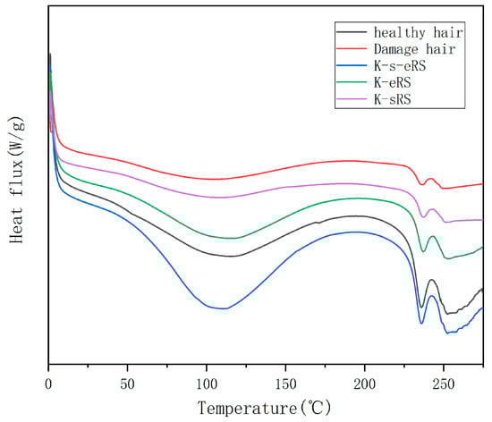DSC is used to evaluate the thermal stability of the heating process of hair fibres, and it can effectively evaluate the thermal stability of the protein structure in hair fibres. Keratin-serine plus enzyme repair solution can improve the structure of hair silk protein and affect the thermal stability of hair silk protein. The peak between 230 and 240 °C is the endothermic peak of the hair sample, and the peak direction of the endothermic direction is downward, as shown in Figure 4.