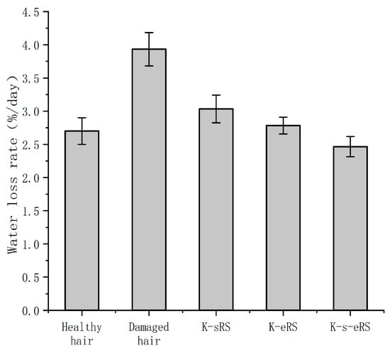 The structure of hair is damaged after cold blanching, and the water loss is serious. The loss of water in hair will cause dry hair. The keratin and serine in the keratin-serine repair solution can play an effective moisturizing effect, but it is easy to lose after cleaning; the presence of the TG enzyme in the keratin plus enzyme repair solution makes the wool-hydrolysed keratin well bound to the damaged site, but the keratin has a large molecular weight, and the locking water moisturizing effect is limited; in the keratin-serine plus enzyme repair solution, the enzymatic grafting or crosslinking of amino acids, keratin, and hair fibroin forms a network structure. When repairing the damaged part, it can be combined with water to lock water better. The membrane structure formed by the crosslinking component on the surface of the fibre can also prevent the loss of hair water, thereby increasing the internal water content. Barba, C. et al. [23] repaired the hair with wool keratin and wool peptide, and measured the increased breaking stress and breaking strain, which is related to the increased water content of the hair. The water retention property test in this experiment proved that the water-locking ability of hair fibre was enhanced, and the increase in water content was conducive to the improvement in the mechanical properties of hair fibre, which corresponded to the results of fracture stress and fracture strain. In this experiment, the water loss rate of hair repaired with the keratin-serine and enzyme repair liquid after 24 h was less than 3%. The water loss rate of the hair samples repaired by Zhang et al. [24] with 5% rabbit hair keratin was about 3.5% after 24 h, and the moisturizing effect of keratin-serine plus enzyme repair solution was better than that of the samples. The reduction in moisture loss can make the damaged hair more silky and smooth, alleviate the trouble of manic hair after perming, and effectively prevent the static electricity phenomenon caused by manic hair.