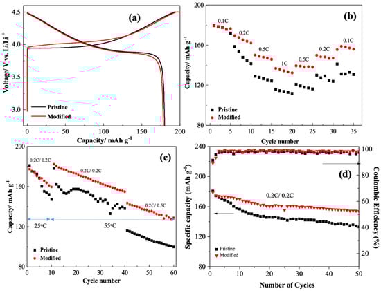 Figure 1a shows the charge–discharge profile of the pristine and modified LCO electrodes. According to the results, the pristine LCO electrode delivered an initial discharge capacity of 180.2 mAh g−1 with a coulombic efficiency (CE) of 91.1%; this is a common capacity and CE of LCO when operated in a high voltage window (4.5–2.8 V). The modified LCO electrode with BU additive delivered an initial discharge capacity of 179.6 mAh g−1 with a CE of 89.4%. The CE of the modified electrode was a little lower than that of the pristine one, indicating that BU causes polarization initially owing to the electrochemical reaction of BU. In fact, the charge curve increased faster than the pristine electrode in a range from 3.9 to 4.2 V; this affection can be concluded to be due to the electrochemical reaction of BU. Typically, this is the reaction voltage range of Co3+ oxidized to Co4+—the main reaction of LCO. Figure 1b shows the rate performance of the two LCO electrodes. From the results, the difference between the two LCO electrodes was observed from 0.2 C. The modified electrode displayed a higher discharge capacity than that of the pristine electrode when the current rate increased to 1 C. Even when the current rate gradually returned to 0.1 C, the pristine electrode, however, cannot recover back to its original capacity. Normally, the capacity of the LCO will be returned easily when charged at only 1 C rate (relatively, not too high) because the LCO has a greater electrical conductivity than other cathode materials such as LFP. However, the LCO was charged to 4.5 V in this rate test, presenting the de-lithiation percentage of LCO as more than 50% and causing the distortion of the CoO6 octahedra, thereby increasing the rehybridization of the Co 3d and O 2p orbitals, as well as reducing the Co-O bond covalently [8,9]. In fact, LCO suffering the distortion of CoO6 will lead to O2 evolution and a high risk of explosion. On the contrary, the modified LCO electrode provides greater rate performance compared with the pristine, indicating the BU stabilizes the LCO structure at a high voltage range operation. Figure 1c shows the cycle performance at room and high (55 °C) temperatures of the two LCO electrodes. For the first 10 cycles, the pristine electrode decays fast at room temperature due to the distortion of CoO6. After 10 cycles, the testing temperature was increased to 55 °C, thereby increasing the capacity, owing to the increment of ionic conductivity of the electrolyte. However, the cycle stability does not present as being stable, with thewobbly curve behavior of the pristine electrode. Although further high-rate performance (0.5 C) results show the aforementioned behavior becomes stable, the capacity presents less than 100 mAh g−1, with a poor retention of 55.3% at significantly higher temperatures and high voltage. In the same testing protocol, the modified electrode delivered 133.7 mAh g−1, with a better retention of 74.7% compared with the pristine. To verify the constant rate (0.2 C/0.2 C) in the cycle test, Figure 1d shows two electrodes were operated at room temperature for 50 cycles. According to the results, the modified electrode containing BU displayed better performance and had a higher capacity and cycle retention (153.9 mAh g−1; 85.9%) than the pristine (133.1 mAh g−1; 73.6%).