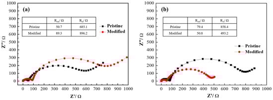 Figure 2 shows the EIS spectra of the two LCO electrodes at different cycles, the 1st and the 60th cycles of Figure 1c. After the formation of the two electrodes, Figure 2a clearly demonstrates the two LCO electrodes have two semi-circles, presenting the impedance of CEI (Rcei) and the charge transfer resistance (Rct) of LCO surface. The Rcei of the pristine and modified electrodes are 50.7 and 89.3 Ω, and the Rct of the pristine and modified electrodes are 685.1 and 896.2 Ω, respectively. Because there are only two semi-circles in the EIS spectra in comparison with two electrodes, this indicates the BU had joined the CEI formation and increased the interface impedance of the BU characteristics in the first cycle. It can be speculated that the CEI formed from the BU and carbonate electrolyte is different from the traditional one from that of carbonate electrolyte only. Interestingly, the Warburg impedance also demonstrates typical diffusion behavior in terms of the interface to the bulk LCO material. The Warburg impedance, in fact, is not only used to calculate the value of diffusion resistance but the diffusion can also be observed through the distinguishment of the angle, by figuring out if it is controlled by resistance or capacitance [10]. According to the result in Figure 2a, the angle of Warburg impedance of the modified electrode is 35.7°, which is lower than that of the pristine electrode (40.2°). Previous literature has discussed that an angle of Warburg impedance lower than 45° presents that the diffusion is controlled by resistance, and capacitance is controlled at higher than 45°. With an angle of 45°, it demonstrates a perfect diffusion without any resistance and capacitance effects. By adding the BU, the diffusion of LCO obviously affects the resistance and dramatically impedes the electrochemical reaction; thus, the Rct has a higher value. Because the diffusion of the modified electrode is controlled by resistance, it indicates that the CEI forms from BU and is not used to store electrons in its chemical composition. Figure 2b shows there are still two semi-circles after cycling in Figure 1c, indicating that electrochemical cycling does not form other compounds and interfaces. However, the Rcei and Rct of the pristine and modified electrodes was changed by the effects of cycling. The Rcei were 79.4 and 50.8 Ω, and the Rct of the pristine and modified electrodes were 858.4 and 493.2 Ω, respectively. These results demonstrate that the pristine LCO was charged to 4.5 V and caused possible side reactions of O2 evolution and electrolyte decomposition from the distortion of CoO6 octahedra. Thus, the CEI has a high impedance due to a thick layer formation or dense structure. Accompanying the high Rcei, the electrochemical reaction will not easily perform on the interface with a high Rct value, which was almost 1.5 times more than the modified electrode. The BU indeed improved those aforementioned problems of LCO charged to high voltage with cycling. Moreover, the angle of Warburg impedance of the modified electrode was then 30.1°, which was still lower than that of the pristine electrode (38.6°) owing to the BU effects.