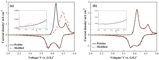 Figure 3 shows the CV results of the two LCO electrodes, which was used to analyze the valence changes and kinetic behavior of the Co ions. Figure 3a shows that there were two redox couples of the pristine LCO in the CV result. The first redox couple was the main reaction of Co3+ to Co4+ at 4.2 V and Co4+ to Co3+ at 3.8 V, respectively [8]. The second redox couple was the Li ion arrangement in the CoO2 framework of ordering at 4.6 V and disordering at 4.3 V [8]. With the BU addition, the modified electrode displayed a delayed reaction of Co3+ to Co4+ at 4.45 V but no certain effect on the reaction of Co4+ to Co3+. The polarization of the modified electrode only took place at the first anodic reaction, indicating that the BU needs an activation for its CEI formation on the LCO surface but had no issue after the CEI had been competely formed in the cathodic scan. From the point of view of this CEI formation, the figure inside Figure 3a displays a reaction took place at around 3.45 V in the modified electrode, but the pristine electrode does not have this reaction peak. This observation explains that the BU is electrochemically oxidized before the reaction Co3+ to Co4+, the reaction Co3+ to Co4+ is, therefore, delayed to 4.6 V, but other reactions, including the ordering of Li ion arrangement in the CoO2 framework and two cathodic reactions, showed almost no difference. To verify the BU effects on the second scan of the modified electrodes, the experiment of Figure 3b is adopted. In Figure 3b, all the CV curves are stacked together with no difference in behavior. In addition, the BU oxidization no longer exists in the second scan. Those results confirm that the BU only reacted in the first scan, and with no polarization once the CEI was completely formed. These two CV results are abided by the explanations of charge and discharge profiles in Figure 2.