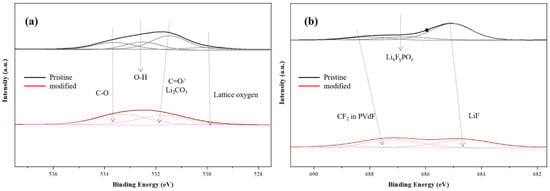 The XPS spectra of (a) O1s and (b) F1s of Modified and Pristine electrodes after 60 cycles in Figure 1c.