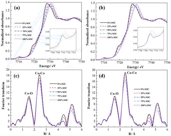 The Co K-edge XANES spectra of (a) Pristine and (b) Modified electrodes at different SOC. The Co K-edge EXAFS spectra of (c) Pristine and (d) Modified electrodes at different SOC.