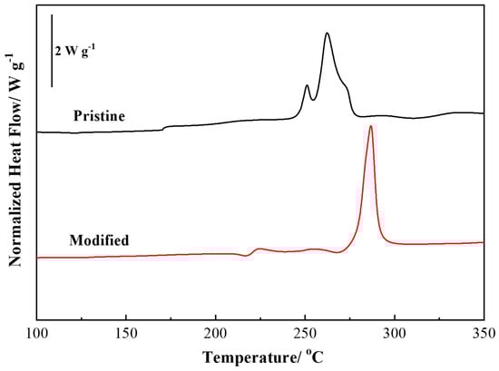 Non-isothermal DSC profiles of Pristine and Modified electrodes at 100% SOC with a heating rate of 5 °C min−1.
