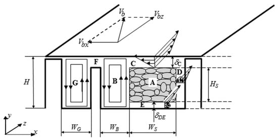 Melting mechanism in the cross-section of a barrier screw. A—solid bed; C, D, E—melt films surrounding the solid bed; B, G—melt pools in the solids channel and melt channel, respectively; F—melt film crossing the barrier gap. Vb is the barrel sliding velocity, WB and WG are the widths of melt pools B and G, respectively, WS is the width of the solid bed, H is channel depth, HS is the depth of the solid bed, and δ denotes the thickness of a melt film (reproduced with permission from []).