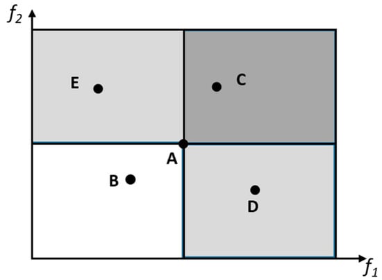 The various objectives can be dealt with in three ways, as follows: a priori, a posteriori, or iteratively. In the first case, the decision maker (DM) initially defines the relative importance of the objectives and the performance of the solutions can be obtained through the use of aggregation functions, e.g., weighted sum, weighted product, or weighted Tchebycheff metric []. The optimum can be found using a traditional single-objective methodology. In the second alternative, the various objectives are optimized simultaneously in order to obtain a set of solutions denoted as the Pareto set. Therefore, two different spaces exist, that of the decision variables and the domain of the objectives. The optimization aims to find the solutions where all objective functions are optimized. The Pareto set is the set of non-dominated solutions, which are the solutions that are incomparable to each other, as it is not possible to state that one is better than another for all objectives simultaneously [,]. Figure 3 illustrates this concept using a problem with two objectives to maximize. The comparison between solutions A and B shows that A is better in both objectives and, thus, A dominates B. The same happens when comparing solutions B and C. In this case, C dominates A, which means that all solutions belonging to the dark grey square dominate solution A. However, when comparing any solution within the light grey squares (solutions D and E versus solution A), it is not possible to conclude that one is better than the other. The best solution can be selected by using additional preference information provided a posteriori by the DM []. In the third approach, the optimization and selection of solutions can be made iteratively and interleaved, i.e., the optimization algorithm delivers different solutions to the decision maker, who indicates the preferences, and then the optimization algorithm runs again [].