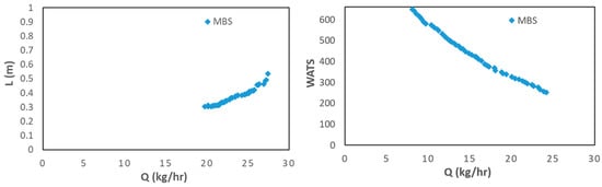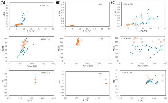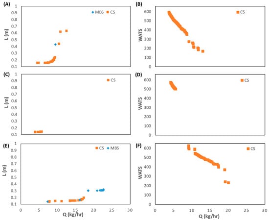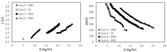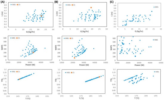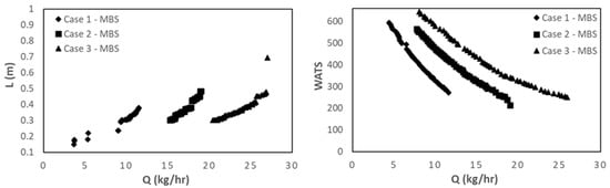 Figure 6 compares the results obtained for Cases 1 to 3 in the same domains as before, i.e., L vs. Q and WATS vs. Q. As anticipated, when the screw speed increases (from Case 1 to Case 3), the Pareto optimal front moves in the direction of higher outputs, but in all cases, the best solutions are only for the MBS. However, when the same variation of screw speed is tested together with higher barrel temperature profiles (Cases 4 to 6, Figure 7), the outcome might be different. For the lower screw speed, when optimizing together Q and WATS, the solutions obtained include both CSs and MBSs, again, because of earlier polymer melting in the CS.