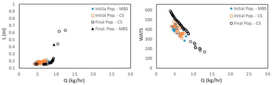 Figure 9 and Figure 10 show similar results for PP. Figure 9 displays the initial and final populations for the two bi-objective optimization runs of Case 8, L vs. Q and WATS vs. Q. Again, there is a clear improvement along the generations. However, in this instance, the CS solutions prevail in the final population. This happens because the melting of PP occurs very fast in the screw due to its thermal properties. Consequently, not only it is unnecessary to use a barrier screw to assist/force melting, but the CS also performs better concerning the other optimization objectives, i.e., WATS vs. Q. The same is observed in Figure 10, where the effect of increasing screw speed is depicted. As for LDPE (Figure 6), the optimal Pareto front solutions allowed a higher output when the screw speed was increased. Nevertheless, at higher screw speeds (Figure 10E), the higher outputs are only achieved by MBS, as they imply later polymer melting in the screw.