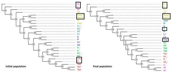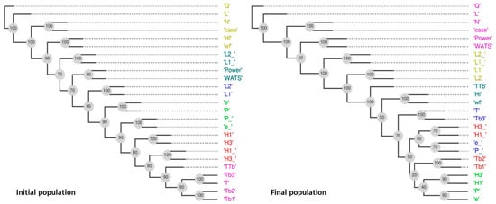 The application of DAMICORE to the six objectives problem of Case 7 yields the phylograms for the initial and final populations of Figure 13 and the resulting Tables of distances 6 and 7. In the figure, the objectives are identified in boxes. The decision variables (DVs) and the objectives are clustered, taking into account the NCD metrics (Section 3.2). The observation of the phylograms allows for the identification of the clusters that share information, as well as the distances of DVs–DVs, DVs–objectives, and objectives–objectives. The distances are represented by the path that is necessary to go through, i.e., the length of the branches on a phylogram. For the final population, the objectives are grouped in the sets (Q, L), (Power, WATS), and (T) and (TTb). From these phylograms, it is possible to determine those distances. For example, Table 6 shows the distances of DVs–objectives for the final population ordered from the lowest to the highest. The following conclusions can be drawn: