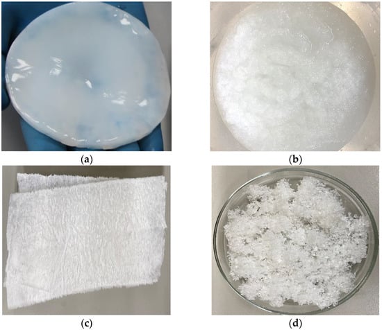 Visualization of the preparation of NBC for nitration: (a) NBC gel-film; (b) homogenized, wet NBC mass; (c) freeze-dried NBC; and (d) freeze-dried, ground NBC.