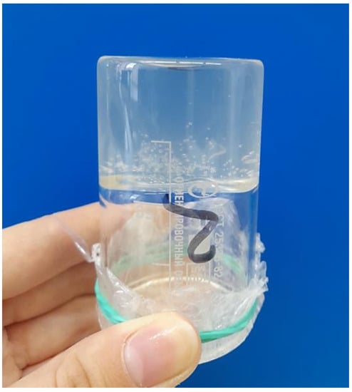 The NBCN samples differ considerably between each other by their basic characteristics; more specifically, the NBCN NA+MC exhibited a higher nitrogen content of 12.27% (0.5% higher than that of the NBCN MA) and a higher viscosity—one that could not be determined by the method described in Section 2.2.4, since the dissolution of the weighed portion in acetone produced a thick, transparent acetonogel (Figure 2). The acetonogel was immobile when the beaker was turned upside-down because of the cellulose nitrate molecules being structured in the acetone solution. It is likely that the acetonogel represents a framework composed of the continuous 3D macromolecular network whose voids were populated with low-molecular acetone. The NBCN MA represents a very viscous, totally transparent solution that slowly flows down when the beaker is turned upside-down. It should be noted that both of the NBCN samples were totally soluble in acetone, corroborating the fact that the nitration was uniform and that the synthesized products were cellulose nitrates.