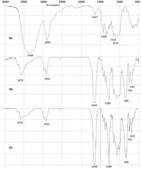 The IR spectrum of the original NBC (Figure 4a) has characteristic frequencies of the basic functional groups typical of both plant-based cellulose [14,55] and bacterial cellulose (BC) [25,56], specifically: 3348 cm−1, 2895 cm−1, 1637 cm−1, 1428 cm−1, 1163 cm−1 and 1111 cm−1 which are assigned to the O–H stretching, asymmetric and symmetric stretching of C–H, O–H bending of absorbed water, asymmetric bending vibration of CH2, C–O–C stretching, skeletal stretch of C–O, and vibration of the b-glycosidic linkage of cellulose, respectively.