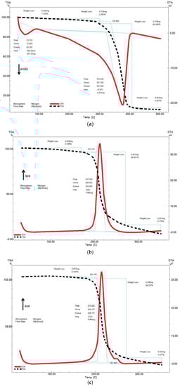 It was discovered from the TGA results for the NBCN samples (Figure 5b,c) that the major thermal degradation of the NBCN samples commences at 201.53–203.79 °C and continues to 270 °C, the weight of the samples changing by 80.65–84.25%. The NBCN samples further continue to decompose with a slight weight loss of 7.68–9.77%. The DTA curves of the NBCN samples (Figure 5b,c) were found to exhibit one narrow exothermic peak at 212–214 °C accompanied by a drop in the NBCN sample weight to 81–84%, suggestive of the high chemical purity of the synthesized NBCN samples. The onset temperature of intensive decomposition of the synthesized NBCN samples was 201–204 °C. The obtained results are on a par with the data on cellulose nitrates derived from commercial cotton cellulose [5], microcrystalline cellulose [14] and NBC [23]. By comparing the DTA curves of the NBCN samples and the original NBC, it is clear that the exothermic peak temperature of the nitrated cellulose diminishes from 375.44 °C to 212–214 °C, which is attributed to the homolytic cleavage of the thermally instable O–NO2 bonds that speed up the thermal degradation of the polymeric cellulose chains. The synthesized NBCN samples feature high specific heats of decomposition of 6.94–7.08 kJ/g—in support of their energy capacity.