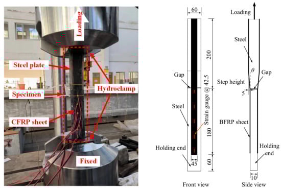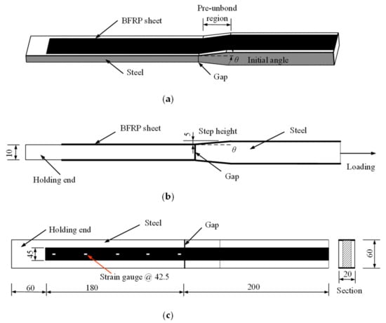 A total of 18 specimens with BFRP sheets bonded on two sides were prepared and tested, marked as S1 to S9, respectively. Each specimen was composed of two steel plates with a 5 mm length gap between them. Q345qD-grade steel was used for all specimens. The geometric dimensions and details of the specimens are shown in Figure 1. The dimensions of the two steel plates were 240 × 60 × 10 mm (length × width × thickness) and 200 × 60 × 20 mm (length × width × thickness), respectively. Two different cross-sections of steel plates were prepared to allow for the attachment of an initial angle. The initial angle of the steel plates was machined using a computer numerical control (CNC) machine. By adjusting the length of the pre-unbond region of the plate, the initial angle was manufactured without affecting the step height and the angle value of the steel plate. The initial angles were set as 0°, 2°, 4°, 6°, 8°, 10°, 12°, 15° and 20° corresponding to specimens S1 to S9, respectively. The bi-directional fabrics with a nominal thickness of 0.20 mm were produced by Tianlong Company (Jiangsu, China). The areal density of the commercial BFRP composites is 210 g/m2, and a commercial two-component epoxy adhesive was used as the polymer matrix. The width and length of the BFRP sheets applied in the current experiment were 45.0 mm and 380 mm, respectively. The specimens were prepared with BFRP sheets bonded on both sides of the steel plates. The BFRP sheet was first bonded to the steel plate on one side, and then to the other side within 15 min. One end of the specimen was clipped with an MTS servo-hydraulic testing machine to make sure the interfacial debonding was triggered on the opposite end. Table 1 shows the design parameters of the tested specimens. Two specimens were tested in each load case.