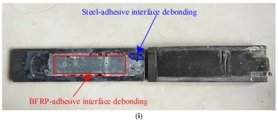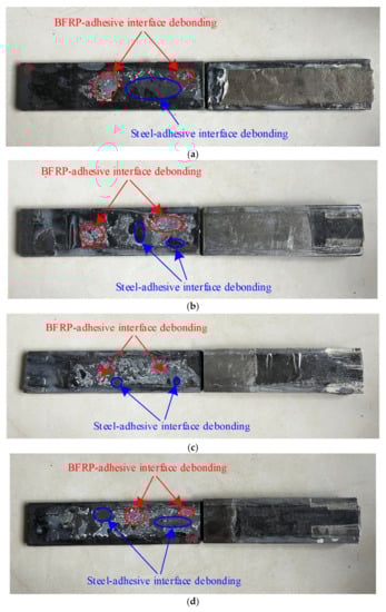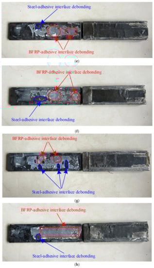 The failure modes of the tested specimens are shown in Figure 3. The calculated bond strength was determined using the Liu model []. All specimens were subjected to a tensile force until debonding failure occurred on either side. At the initial stage of loading, the load increased roughly linearly with the increase in the relative displacement at the interface. As the load continued to increase, the BFRP sheet debonded from the steel surface at the middle gap of the specimen. Subsequently, the debonding of the BFRP sheet gradually expanded to the end of the specimens. Specimen S1 failed in a pure shear debonding mode, while mixed shear and peeling failure modes occurred in specimens S2 to S9. The failure surfaces of all specimens were failure modes of a combination of BFRP-sheet–adhesive failure and steel-plate–adhesive failure. As the loading increased, the debonding transferred gradually from the steel–adhesive interface to the BFRP-sheet–adhesive interface. In other words, the specimens with a smaller initial angle are more likely to exhibit interfacial debonding between the steel plate and the adhesive. In contrast, the specimens with a larger initial angle are more likely to exhibit peeling at the interface between the BFRP sheet and the adhesive. Nevertheless, for specimens with an initial angle, the debonding progress was caused by a combination of two fracture modes, i.e., peeling and shear debonding modes. The normal force at the interface between BFRP sheets and steel plates increases with the increase in the initial angle. When the initial angle of steel plates is greater than 6°, the specimens are more likely to exhibit peeling at the interface between the BFRP sheet and the adhesive.