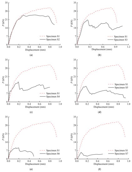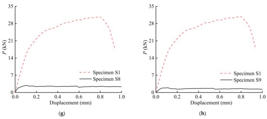Load–displacement curves of specimens: (a) S2; (b) S3; (c) S4; (d) S5; (e) S6; (f) S7; (g) S8; (h) S9.