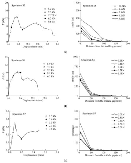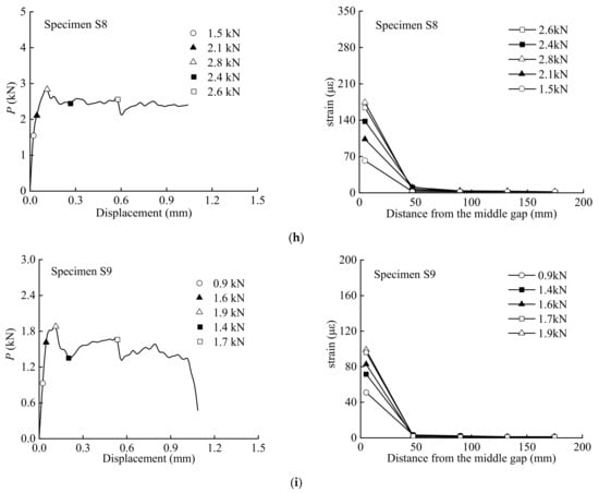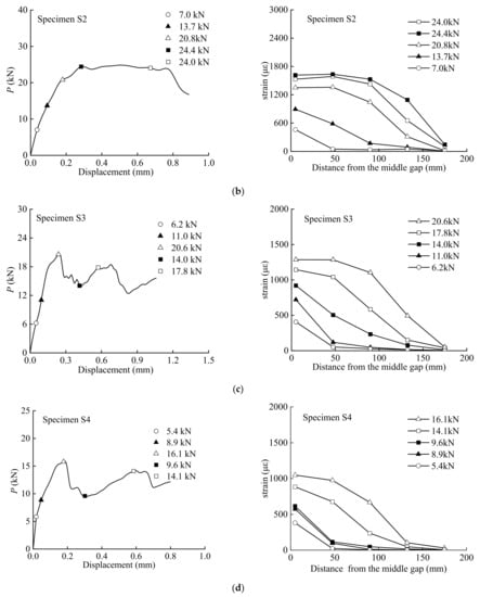 Figure 5 presents the strain distributions observed during the tests. The strain distributions corresponding to the marked points on the load–displacement curves are plotted. As can be seen, when the load was initially applied, the strain response was first observed only at the middle gap of the specimen, and the value increased with increasing load. Macroscopic debonding from the middle gap occurred when the maximum load was reached. When the initial angle was less than 6°, strain increased at the loaded end. As the strain approached the loaded end, a strain plateau was formed. The results from the tests show that the strain generally increased with the load levels and decreased from the gap at the middle of the specimen to the free end of the BFRP sheet. The debonding propagation of the interface can be observed from the strain distribution since there was no strain response in the undamaged regions.