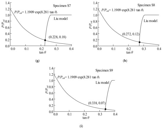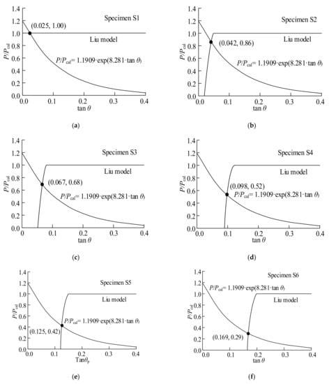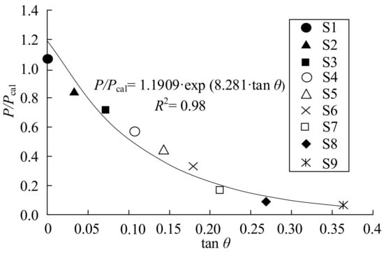 For the combined fracture mode, the intersection points in Figure 7 represent the mixed-mode bond strength. Therefore, the corresponding values of P/Pcal can be calculated using the values of tan θ at these intersections. The results are represented in Figure 8. The values of P/Pcal and tan θ are provided in Table 6. For all specimens, the analytical strengths are in good agreement with the experimental results.