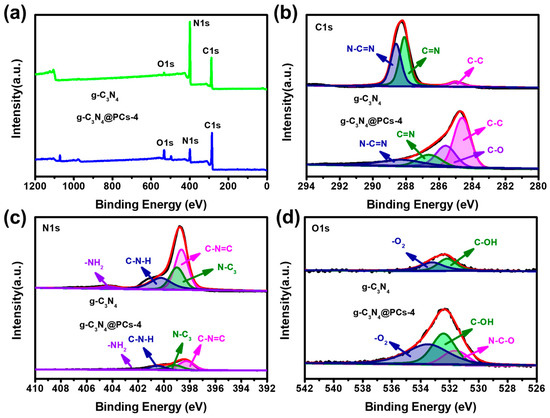 XPS survey spectrum (a) and high resolution XPS spectra of C 1s (b), N 1s (c), and O 1s (d) for g-C3N4 and g-C3N4@PC-4.