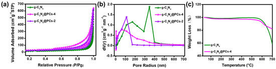 To verify the specific surface areas and pore size distributions of the prepared materials, N2 adsorption/desorption isotherm curves and the BJH method were performed (Figure 3). The results show that the specific surface areas of g-C3N4, g-C3N4@PC-2, and g-C3N4@PC-4 were 51.1, 79.2, and 98.3 m2/g, respectively. According to the BJH method (Figure 3b), the average pore sizes of g-C3N4, g-C3N4@PC-2, and g-C3N4@PC-4 were 85.7, 27.0, and 37.7 nm, respectively, indicating the formation of macroporous structures for g-C3N4 and mesoporous structures for g-C3N4@PC. At the same time, the pore volumes of g-C3N4@PC-4 presented a distinct increase to 0.9784 cm3/g compared to pristine g-C3N4 (0.9145 cm3/g). Abundant mesoporous structures and a higher specific surface area and pore capacity of g-C3N4@PC compared to pristine g-C3N4 promoted the rapid diffusion of the target analytes and provided more adsorption active sites for the targeted analytes [47]. Moreover, TG was applied to investigate the thermal stability of the composites in this work. Figure 3c demonstrates that the as-prepared composites exhibited excellent thermal stability within 550 °C.