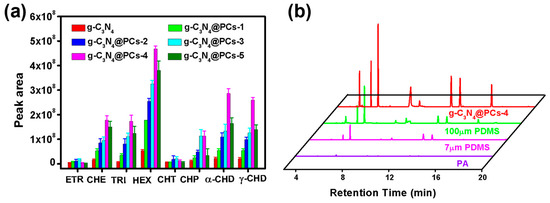 To explore the extraction performances of the as-prepared composites, the extraction efficiencies of pristine g-C3N4 and g-C3N4@PC toward OCPs were investigated by means of SPME. As shown in Figure 4a, the extraction efficiency of g-C3N4@PC materials was significantly improved because of higher specific surface areas and richer chemical groups. As the enlargement of CNCs amounts, the extraction efficiencies of g-C3N4@PC exhibited a trend of first increasing and then decreasing, and g-C3N4@PC-4 presented the optimum performance, owing to the synergy effects of g-C3N4 and CNCs. On the one hand, the introduction of CNCs promoted the formation of microporous and mesoporous structures, which increased the pore volume of g-C3N4@PC, resulting in an improvement in its adsorption capacity for target analytes. On the other hand, there were abundant oxygen-containing functional groups and other chemical groups in g-C3N4@PC, which promoted adsorption for polar groups. This is consistent with the results of the XPS characterization of g-C3N4@PC. However, when the amount of CNCs reached the maximum, the extraction efficiency decreased due to the reduction in intermolecular force and the influence of aggregates. Furthermore, comparisons of the extraction efficiencies between the g-C3N4@PC-4 coating and commercial PA and 7/100 μm PDMS were also studied (Figure 4b). It was found that the extraction efficiencies of g-C3N4@PC SPME fibers for OCPs were much higher than that of PA and PDMS commercial coatings, with ratios approximately 5–30 and 2–15 times, respectively.
