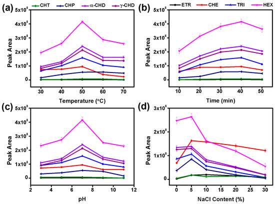 Due to the change in extraction temperature, the distribution coefficient of analytes between the g-C3N4@PC coating materials and the sample substrate changes and affects the mass and heat transfer effects of extraction efficiency. Increasing the extraction temperature makes for increasing the Henry constant and accelerating the entire extraction process. However, the distribution coefficient between the g-C3N4@PC coating and the water sample showed a downward trend at this time, which reduces the extraction amount when the system is in equilibrium. Figure 5a displays the influence of temperature on the extraction performance of g-C3N4@PC for OCPs. The extraction amount of OCPs showed a trend of first increasing and then decreasing as the temperature increased. The optimal extraction temperature for most analytes was 50 °C in this study.