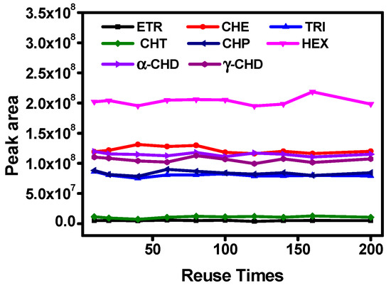 As SPME is a technology related to adsorption equilibrium, the effect of extraction time on extraction performance between 10 and 50 min was also investigated. In Figure 5b, the adsorption capacities for ETR, TRI, HEX, CHT, CHP, α-CHD, and γ-CHD increased with the extension of extraction time and approached the maximum adsorption equilibrium in 40 min. However, the absorption amounts for ETR, TRI, HEX, CHP, and α-CHD gradually showed signs of decreasing with the increase in extraction time, which was due to the potential competitive adsorption effect between OCPs and water [48,49]. In terms of both time consumption and extraction efficiency, the optimal extraction time for this work was set at 40 min.
