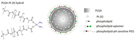 In order to solve these problems, PEG analogs were born on demand. PEG-like brush polymers not only enhance cycling half life but also do not induce an anti-PEG antibody response. For example, poly (polyethylene glycol methyl ether methacrylate)—p (PEGMA) is a methacrylate polymer having a low ethylene glycol side chain that has been used in a variety of protein–polymer conjugates [30,31]. In addition, poly(N-(2-hydroxypropyl) methacrylamide) (p(HPMA)) is another water-soluble and biocompatible polymer that can be used to increase half life in vivo and decrease associated immunogenicity [32,33]. Furthermore, zwitterionic poly(carboxybetaine) (PCB) with good biocompatibility and superior hydrophilicity was introduced as a PEG substitute for protein modification. As reported by Li et al. [34], the generation of PCB-specific antibodies was minimal and insensitive to increasing protein immunogenicity. A pH-sensitive PEG derivative polymer, poly(lactic-co-glycolic acid) (PLGA), coated with phospholipid-DNA aptamers and an acid-labile hydrazone linkage was designed (Figure 2) [35]. The hybrid polymer encapsulating platinum (II) could target a cell-spanning protein overexpressed to more than 90% of late-stage ovarian cancer, mucin 1 (MUC1), thus achieving enhanced cancer therapy. It follows that PEG analogs have a wider application prospect in the field of biomedicine.