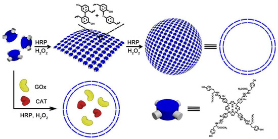 Biomimetic polymer is a kind of polymer that resembles natural polymers in form, appearance and properties with the benefits of synthetic polymers. For example, trehalose can form a special protective film in cells under harsh conditions, such as high temperature, high cold and dry water loss, effectively protecting the structure of biomolecules from being destroyed, thus maintaining the life process and biological characteristics of living organisms [36,37,38]. Therefore, natural disaccharide trehalose polymers can stabilize biological macromolecules under extreme conditions. For example, Diaz-Dussan et al. [39] reported a trehalose-based polymer that can be used as a cryoprotectant and three-dimensional (3D) cell scaffold for cell encapsulation and organoid production. Polyelectrolytes (PEs) molecules that carry multiple negative or positive charges may be functionalized by absorbing proteins at the top of the architecture or by inserting one or more kinds of proteins [40]. In particular, natural PEs have been extensively investigated for drug delivery because of their readily available, low toxicity, biodegradable and biocompatible properties. Among them, polysaccharides are the most promising materials, such as dextran [41], cellulose [42], and pectin [43], which are naturally derived linear and/or branched polymers widely used as PEG alternatives in the fabrication of therapeutic protein/drug conjugates. Recently, PSA-rFVIII (a novel polysialylated recombinant coagulation factor VIII—BAX 826) has completed a Phase I clinical trial (NCT02716194) in patients with severe hemophilia A and demonstrated long circulation half life with adequate safety and tolerability [44]. Another example of biomimetic polymers is heparin-mimicking polymers, such as carboxymethyl benzylamide sulfonate dextrans (CMDBS) [45], polysulfonated polymers [46,47] and sulfated synthetic glycopolymers [48]. Covalent dimerization of tyrosine in a horseradish peroxidase (HRP)-catalyzed system was an efficient method for enzyme-catalyzed preparation of polymers. Liu et al. constructed polymer nanocapsules with porphyrin photosensitizers as building blocks based on HRP-catalyzed tyrosine dimerization (Figure 3) [49]. The polymer nanocapsules further encapsulated glucose oxidase (GOx) and catalase (CAT) to obtain a biomimetic cascade nanoreactor (GOx/CAT-NC) for starvation and photodynamic cancer therapy which contribute to the advancement of complementary modes of spatiotemporal control of cancer therapy. These biomimetic polymers can stabilize, encapsulate and control release proteins, enhancing therapeutic efficacy and reducing side effects in therapeutic applications.