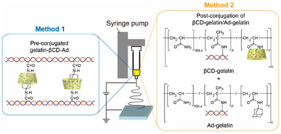 In addition to improving pharmacokinetics, polymers can also impart new properties to proteins to create a stimulus-responsive system. For example, polyacrylamides, such as poly(N-isopropyl acrylamide) (p(NIPAAm)), have a lower critical dissolution temperature which allows polymers to precipitate with increasing temperature [62]. There are also conjugates of pH-responsive ionic polymers, such as polyacrylic acid [63] and poly (N,N-dimethylaminoethyl methacrylate) (p(DMAEMA)) [64]. The use of stimulus-responsive polymers in disease theranostic applications may enable a more controllable and effective process, for example, hyperthermia-mediated cancer treatment [65] and acid response nanoprobe in cancer diagnosis [66]. Polymer- and/or protein-based nanofibers that promote stable cell adhesion have drawn increasing attention as well-defined models of natural 3D extracellular matrix. Kentaro et al. fabricated two types of stimulus-responsive gelatin-containing supramolecular nanofibers that can be utilized as well-defined, switchable 3D microenvironments for cells. The first type of nanofibers was prepared by coupling the host–guest inclusion complex to gelatin before electrospinning, while the second type of nanofibers was fabricated by coupling gelatin to polyacrylamide functionalized with the host (βCD) and guest (Ad) moieties followed by conjugation in the electrospinning solution (Figure 4) [67]. The stimulus responsive was achieved by elasticity switching under physiological conditions by adding/removing soluble guest molecules. In addition to this, there are other polymers that respond to redox agents [68], photo irradiation, CO2 [69], enzyme [70], electric [71] and/or magnetic field [72], photo radiation [73] and so on.