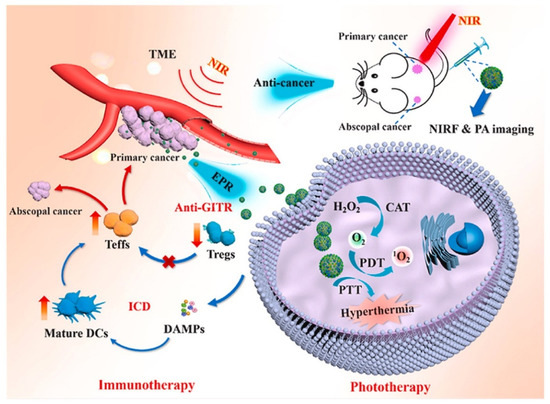 - Sun, Q.; Yang, Z.Z.; Lin, M.; Peng, Y.W.; Wang, R.D.; Du, Y.T.; Zhou, Y.; Li, J.J.; Qi, X.R. Phototherapy and anti-GITR antibody-based therapy synergistically reinvigorate immunogenic cell death and reject established cancers. Biomaterials 2021, 269, 120648. [Google Scholar] [CrossRef]
