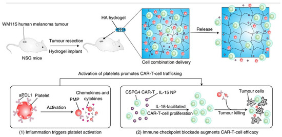 - Hu, Q.Y.; Li, H.J.; Archibong, E.; Chen, Q.; Ruan, H.T.; Ahn, S.; Dukhovlinova, E.; Kang, Y.; Wen, D.; Dotti, G.; et al. Inhibition of post-surgery tumour recurrence via a hydrogel releasing CAR-T cells and anti-PDL1-conjugated platelets. Nat. Biomed. Eng. 2021, 5, 1038–1047. [Google Scholar] [CrossRef]