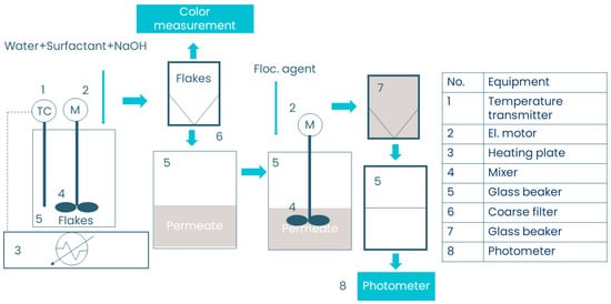 Each sample was tested with each surfactant and test condition in combination until satisfactory de-inking (95%) was achieved. The first step of the experiment was to prepare the solution. A 400 mL glass beaker was placed on a balance and tared. Using a Pasteur pipette, 0.5 g of surfactant was added to the beaker (for liquid surfactants). Next, 0.2, 0.4, or 1.0 g of NaOH was added based on the test condition. Finally, the beaker was filled with water to a total weight of 200 g. The beaker was then secured to a heating plate with a rubber belt. After the addition of the sample flakes to the beaker, the agitation speed was set to 800 rpm. The color change was measured using a colorimeter. After the set retention time, the sample flakes were separated from the liquid phase using a coarse sieve. The liquid phase was collected for flocculation. The experimental procedure is shown in Figure 1.