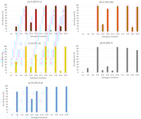 Influence of different pigments with different cleaning agents under conditions A and B (the colors of the bars represent the colors of the pigments) (a) Sample 1 with pigment PR 57:1,(b) Sample 2 with pigment PR 146, (c) Sample 3 with pigment PY 13, (d) Sample 4 with pigment PBk 7, (e) Sample 5 with pigment PB 15:4.