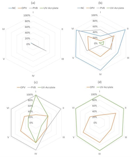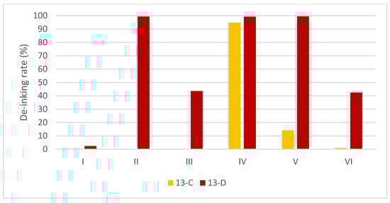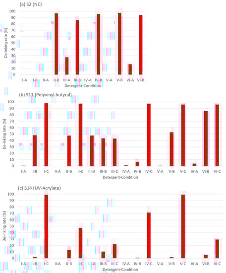 For the PVB and UV acrylate binder, where “peel off” effects were observed (Figure 4b,c), detergents had little contribution to the de-inking effect. No de-inking effect was shown under condition A. For condition B, the highest de-inking rate was measured with detergent VI (85.83%). Under condition C, all the detergents except III showed a complete de-inking effect (95%).