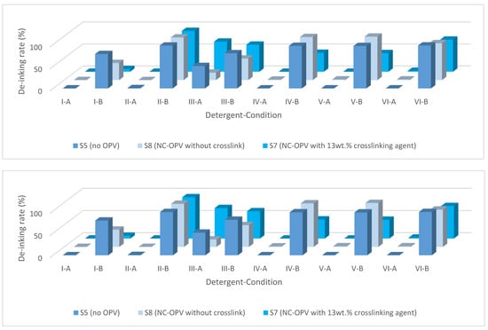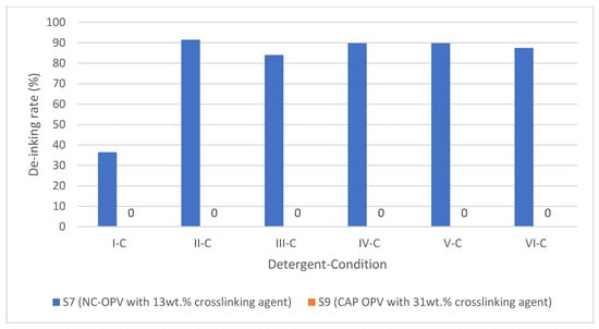 From Figure 5, it can be observed that the addition of OPV has a limited impact on the de-inking rate when using detergents II, IV, and V, provided that these detergents are capable of achieving complete de-inking. For example, under condition C, Sample 7 with 13 wt.% crosslinked NC-OPV can be de-inked. However, Sample 9 with 31 wt.% crosslinked CAP-OPV showed no de-inking effect with all the detergents, even under condition D (Figure 6).