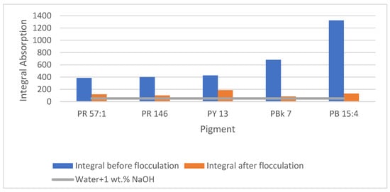 The results of the study are presented in three parts. The first part (Section 3.1, Section 3.2 and Section 3.3) focuses on the influence of various printing ink components on the de-inkability of the printing inks. This part details the specific properties of different ink components and their impact on the de-inking process. According to the visual observations during the experiment, a 95% de-inking rate can be regarded as complete de-inking. The second part (Section 3.4) focuses on the de-inking performance of different cleaning agents. The final part (Section 3.5) introduces the results of the flocculation efficiency after de-inking. This is a critical step in ensuring water reusability at recycling plants that carry out de-inking.