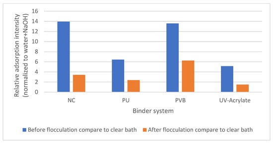 For the UV-crosslinked binder system, de-inking effects were only found under condition C. As the monomer of the UV-crosslinked acrylate has a carboxyl group, it is also sensitive to the highly alkaline environment [39]. Additionally, its crosslinked structure further limits the diffusion of OH- groups into the binder, and this explains why the reaction only happened at 2 wt.% NaOH and 70 °C, as the temperature contributes positively to the diffusion. A similar protective effect was detected with detergents II, III, IV, and VI. The reason for the result of V-C as an exception is due to its emulsion effect specifically towards acrylate, which slightly positively contributes to the cleaning effect (99.09% vs. 98.87%) [80].