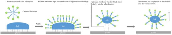 The earliest research on cleaning plastic films with surfactants was carried out by Gecol et al. using nonionic surfactants, including ethoxylated nonylphenol, ethoxylated alcohol, and ethoxylated amine, which were reported to be effective in a solution with a pH over ten and heating under 55 °C [64]. A series of studies were conducted to test different surfactants (anionic, cationic, nonionic, and zwitterionic) on water-based and solvent-based ink systems with different colors [39,64,65]. These researchers reported that water-based ink could be dissolved without a surfactant at a high pH value (11–13). Quandary ammonium cations present the best de-inking performance, especially cetrimonium bromide (CTAB) [65].