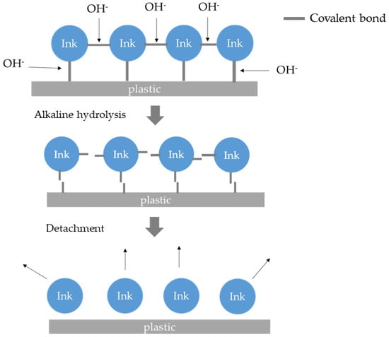 Soil removal is the most crucial step in de-inking as it breaks the mechanical (intersurface diffusion) and chemical adhesion (hydrogen bonds, covalent bonds, and Van der Waals force) between the plastic surface and the printing ink [60,61,62]. Four different removal mechanisms were summarized as (1) roll-up, (2) spontaneous emulsification, (3) soil softening, and (4) encapsulation [63]. Since all de-inking experiments (Table 2) were carried out above the critical micelle concentration (CMC) of the surfactant, the dominant mechanism for plastic de-inking should be the solubilization of the binder in the micelle, known as solubilization or encapsulation.