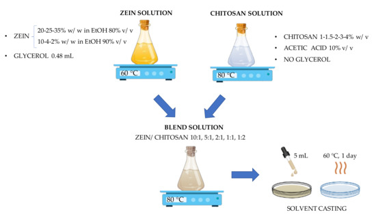 The solvent casting technique was used for the production of the polymeric films. Initially, the optimal solution composition and process conditions for obtaining transparent and defect-free films composed of pure zein and pure chitosan were investigated using a hydroalcoholic solution of ethanol at two different percentages (80% and 90% v/v) and acetic acid 10% v/v, respectively.