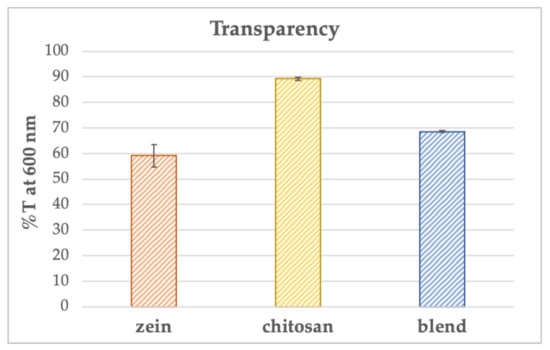 The test results are shown in Figure 3. In particular, the chitosan films, as can already be deduced from Figure 2, present the highest transparency values, %T equal to 89.2 ± 0.7%, above the limits set for packaging materials, i.e., 80%, reported in detail in [23], from which it can also be noted that the results are comparable with those obtained with biopolymers, such as polyhydroxyalkanoates (PHAs) and low-density polyethylene (LDPE). Instead, both zein films and blends presented %T values of 59.1 ± 4.4% and 68.6 ± 0.3%, respectively, below the limits of transparent materials, falling into the category of translucent materials. Therefore, zein films and blends, having lower transparency values, seem to offer better barrier properties against light transmission on foods.